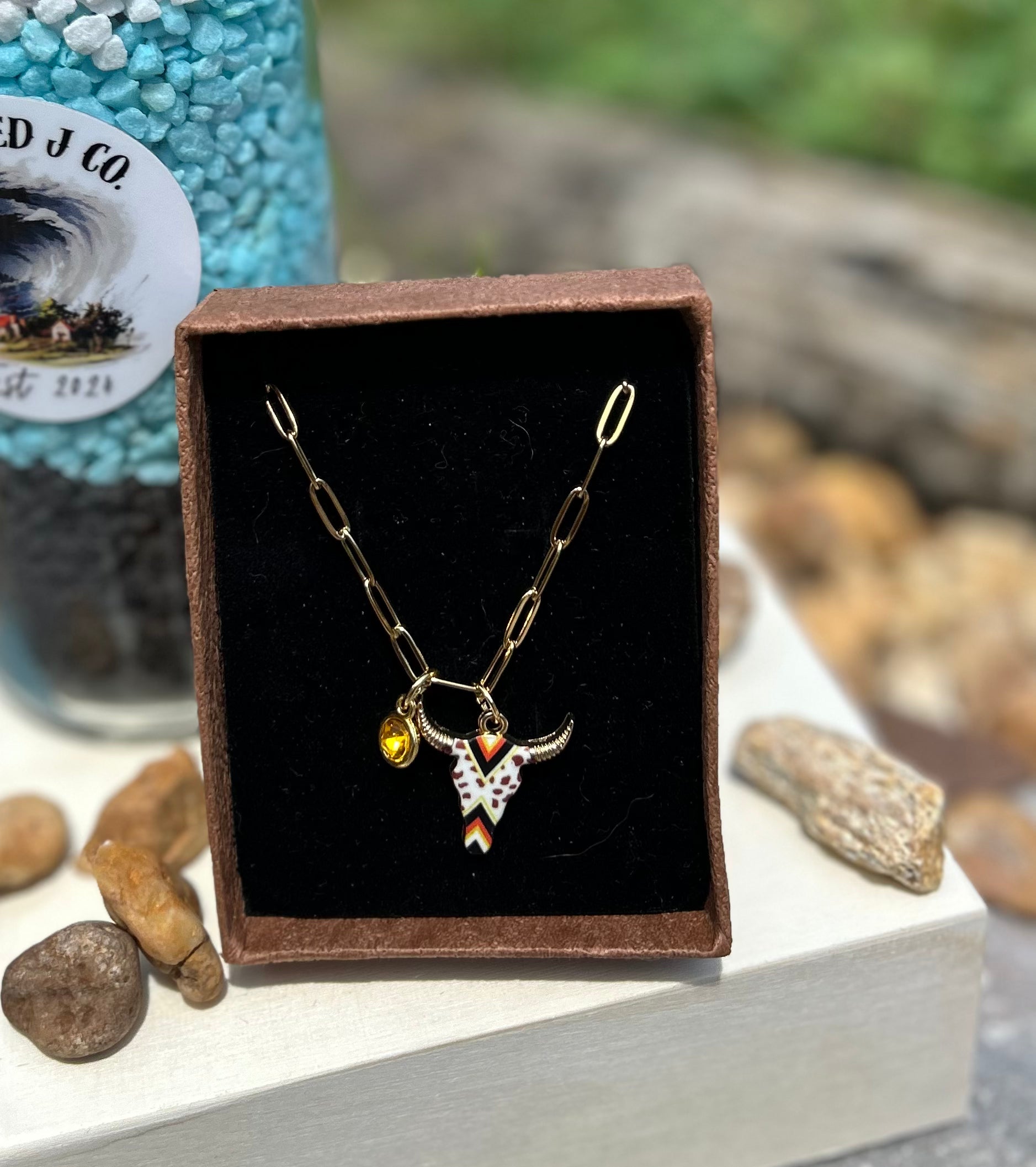18 inch stainless goldplated chain, cow Aztec charm and Yellow gem charm